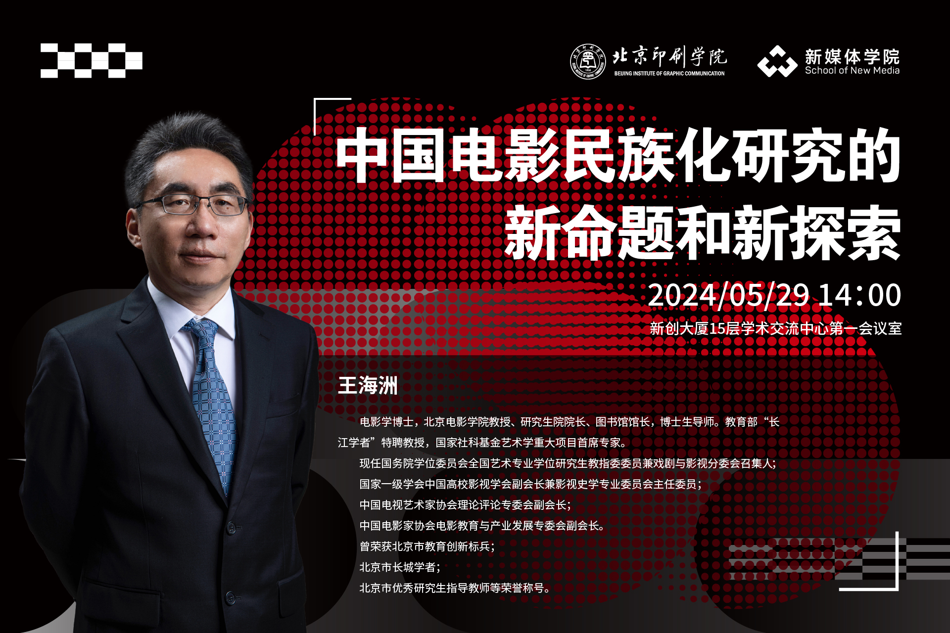 主讲人:王海洲 电影学博士 北京电影学院教授 研究生院院长 图书馆馆长 国际社科基金艺术学重大项目首席专家