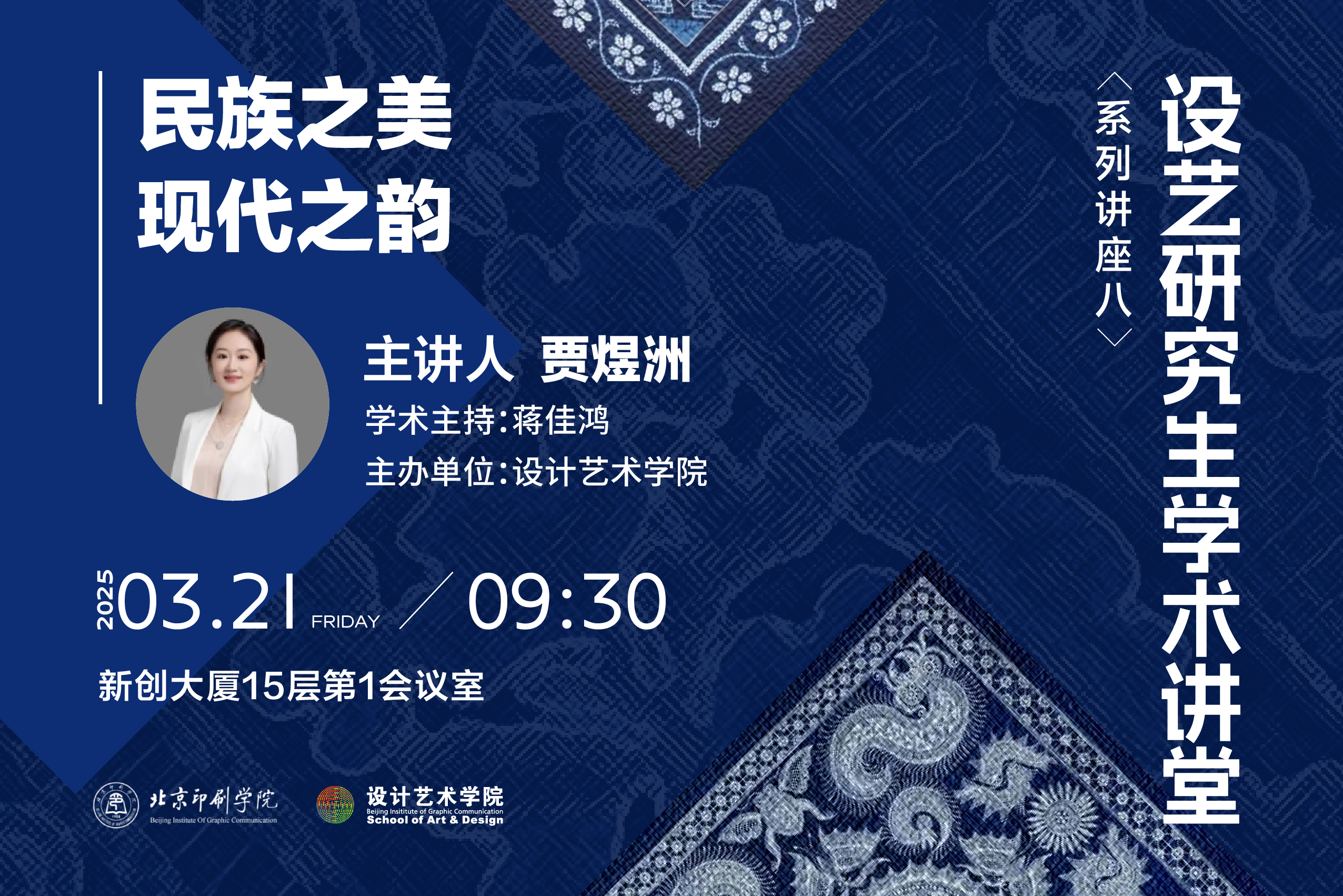主讲人:贾煜洲,北京服装学院艺术设计学院副教授,中国民族民间工艺美术家协会文化创意设计专业委员会秘书长、北京原创设计推广协会理事。从事民族图案与非遗文创设计研究,拥有15年非遗田野考察的经验积累,足迹遍及40余个中国少数民族聚居村落。主持及参与国家社科基金艺术学及其他国家、省部级项目共5项,发表核心期刊论文6篇,与企业携手完成多个设计项目,致力于探索中国民族符号创新转化的设计实践路径。