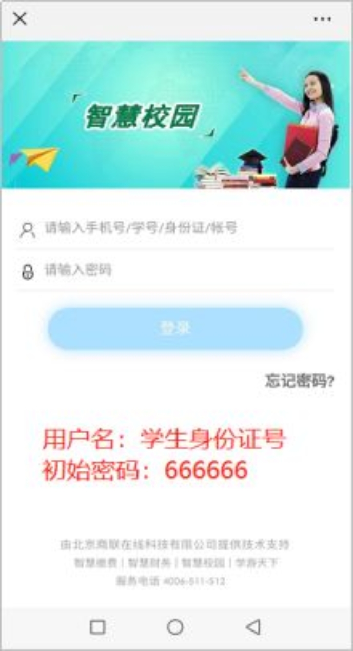 第三步:进入登录页面,输入用户名(学生身份证号)和密码(初始密码666666),点击“登录”,首次登录需修改密码(请牢记修改后的密码)。
