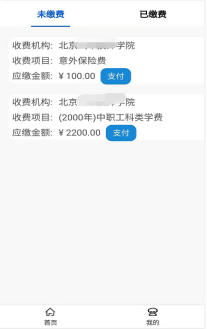 支付成功 登录成功后,点击“我要缴费”或点击“我的”—“我的缴费”。 |